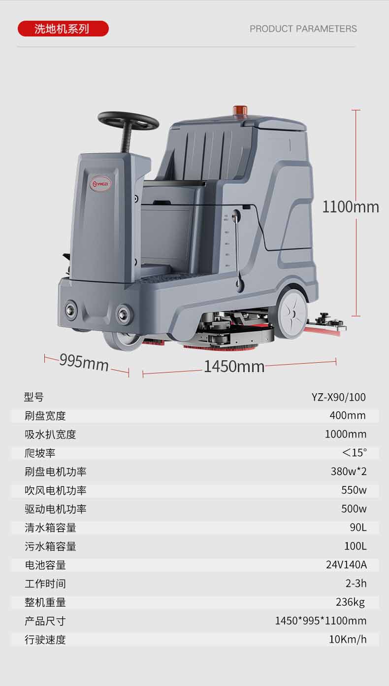 扬子X90-100驾驶式洗地机充满电以后可以连续工作2-3h,“洗擦吸”三合一,完成硬质地面卫生清洁工作。大容量水箱能够持续清洁,避免污水需要反复倾倒问题。