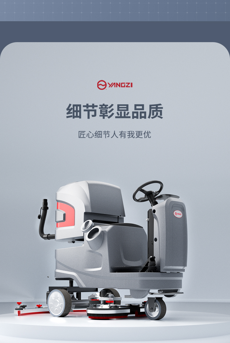扬子X6工厂驾驶式洗地机设备将吸水电机安装在了水箱盖上,可以实现90旋转,避免了安装在底部不好维护的问题,也降低了使用中的噪音。洗地机采用弧形吸水扒,解决了有些产品吸水